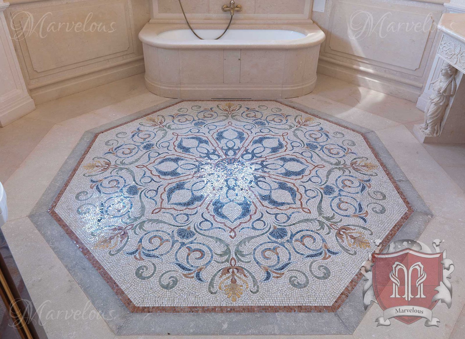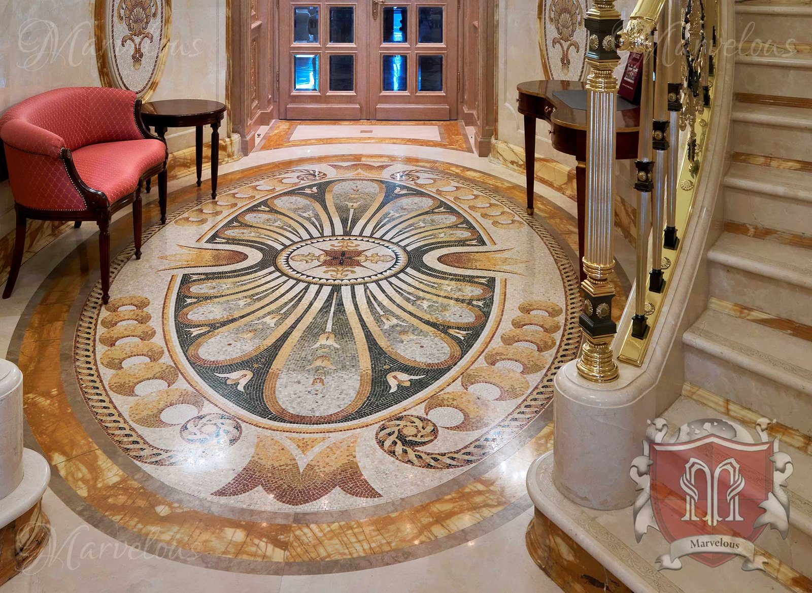 Check out some of our magnificent mosaic floor work. The intricate designs use only the finest marble, and are literal works of art. Each project features a tiled centerpiece and are directly influenced by Italian architecture and history. The natural elements combined embody royalty, and form a harmonious whole. With notes of gold and pewter, each project has value and epitomizes real beauty.