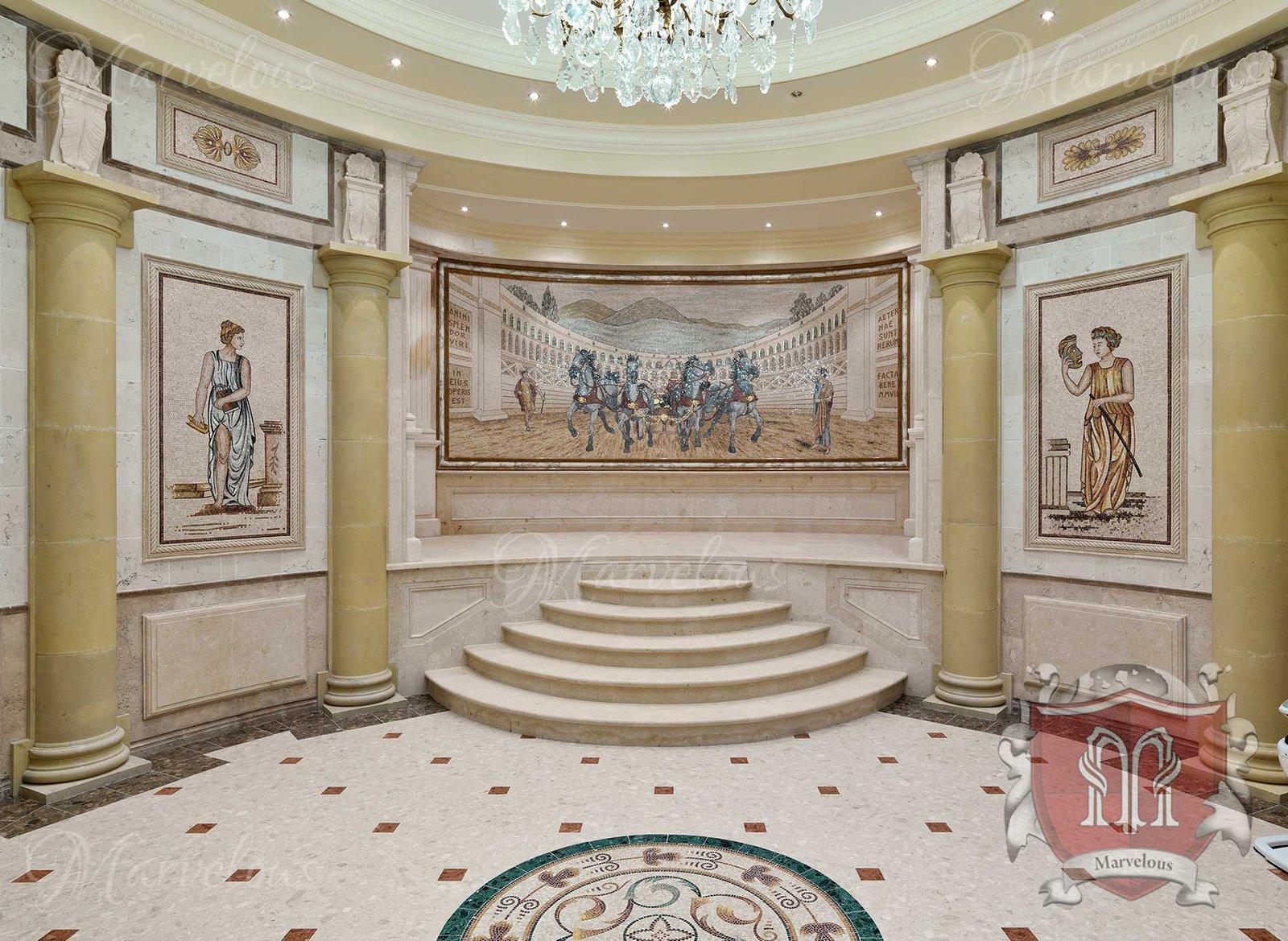 An Oratorio often deals with sacred topics, making it appropriate for performance in holy places, such as the church. In Marble Wall Mosaic: Oratorio, unity and variety come together in such a spiritual way. The mixture of ships sailing, a traditional Italian fountain and gold leaf set the stage for a beautiful concert. The placement of all the marble is deliberate and makes it appropriate to display in even the finest estate.