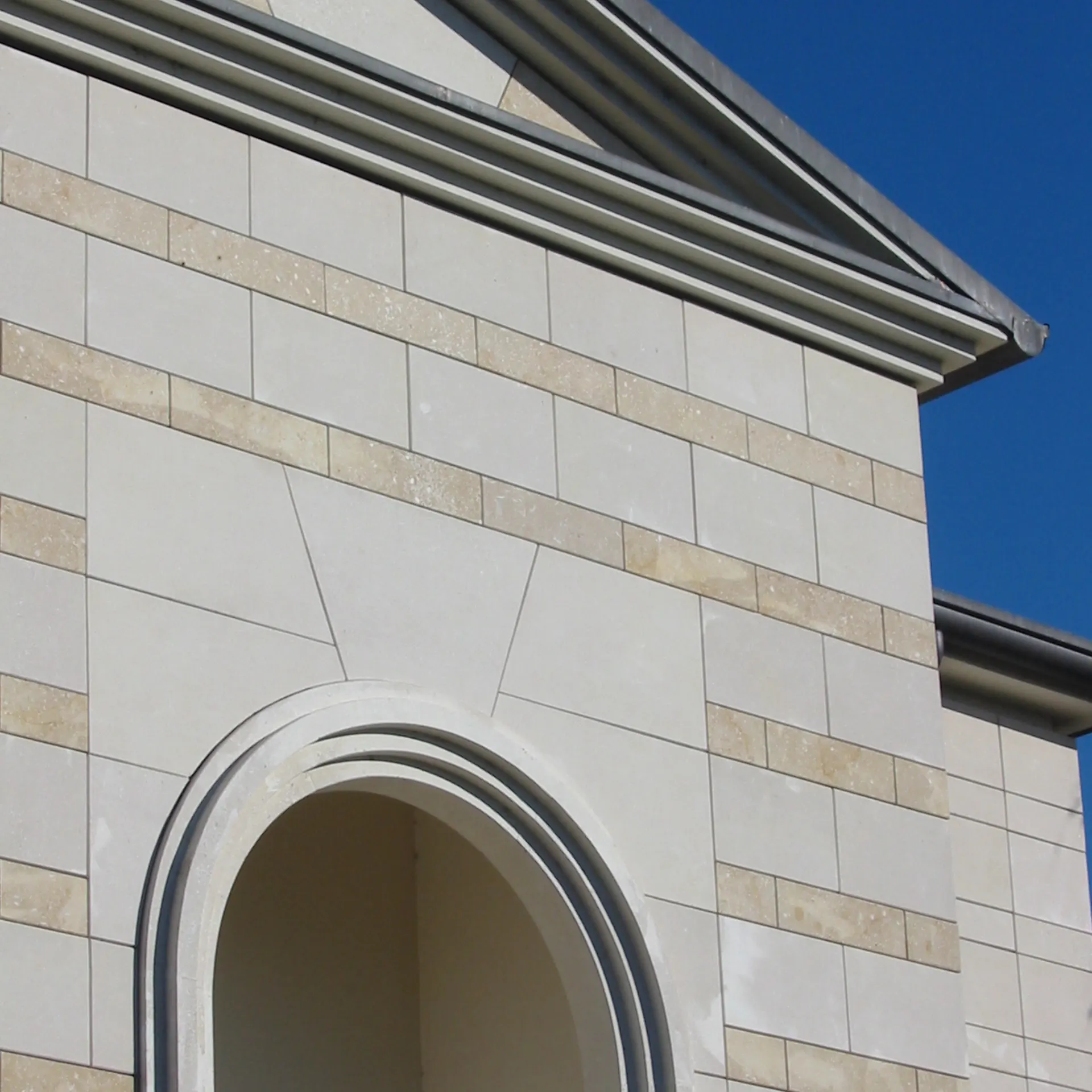 The focal point of the project is the large, recessed arched entryway — a formal gesture that evokes classical architectural influences. Around the perimeter of the arch, we installed a prominent molding system nearly 10 inches wide, custom-carved to follow the gentle curve of the arch above the door. This bold surround, executed in the lighter limestone tone, frames the entrance dramatically while contrasting with the more textured cladding of the adjacent walls. The interplay of smooth and rough finishes highlights craftsmanship and lends architectural depth to the elevation.
