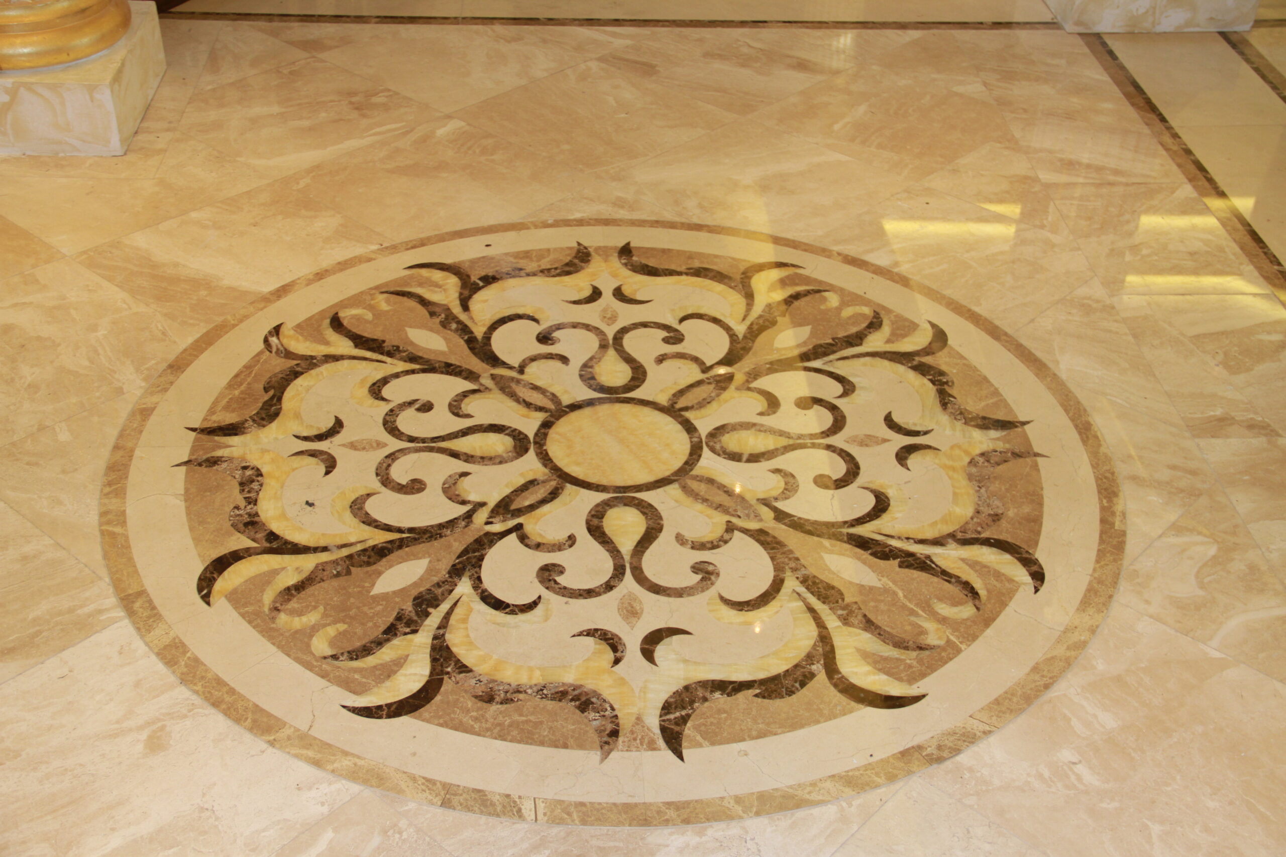 This grand room project features an elegant Botticino marble floor accented by several striking medallions and column details. The client’s fondness for cream and gold hues guided the design, using a medallion background of Spanish Creme Marble, Light Imperator, Dark Imperator, and vibrant Yellow Onyx.