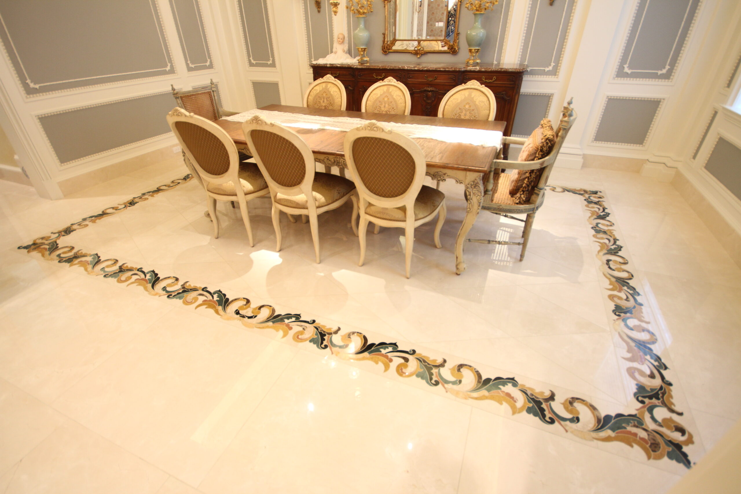 For this distinguished project, custom marble flooring was designed and installed in the dining room of a Texas residence. The main surface features Spanish cream marble tiles that create a warm and luxurious atmosphere. The floor includes a diamond-shaped pattern, precisely cut inside the border beneath the dining table, offering a unique and elegant visual effect.
