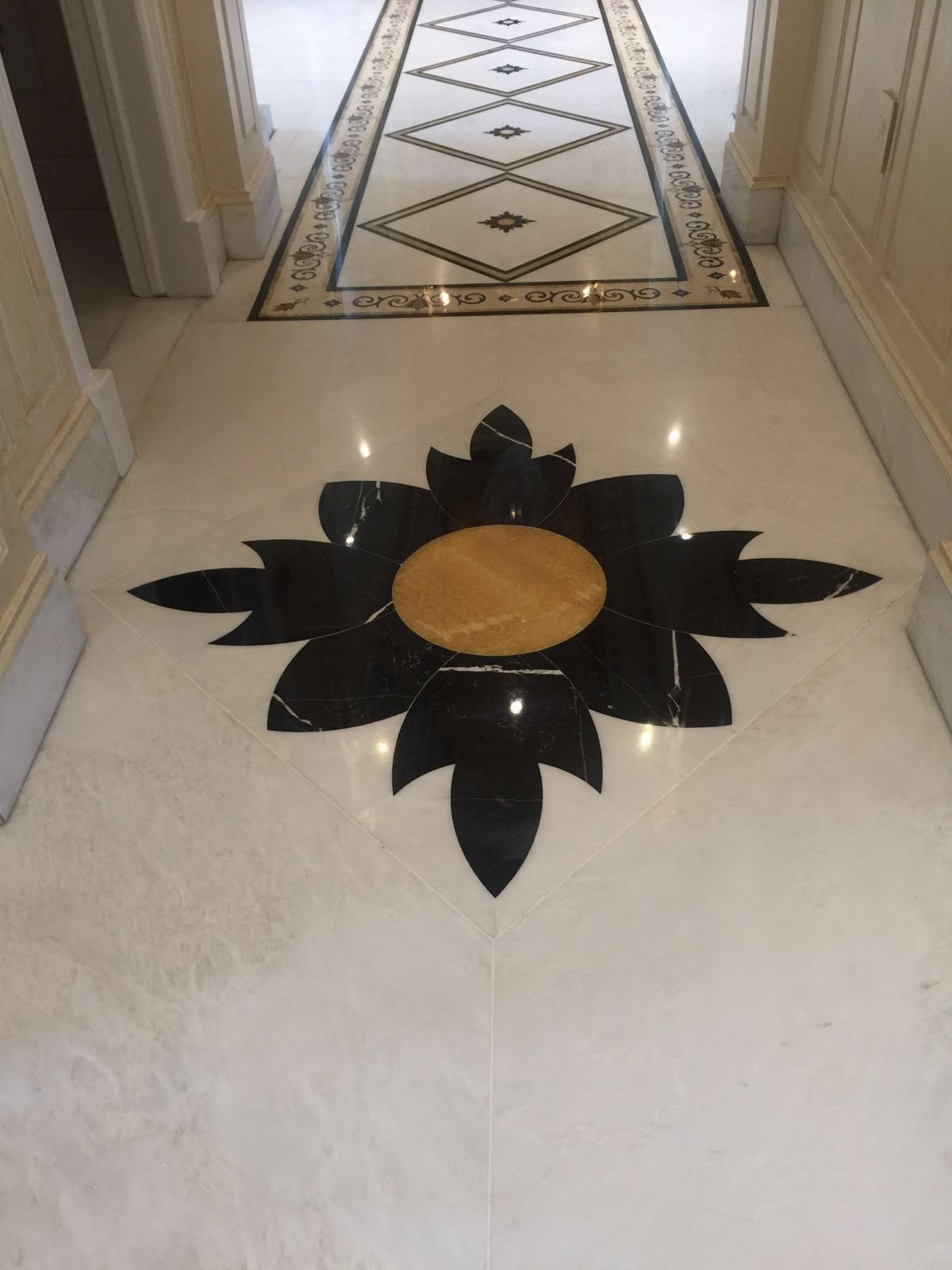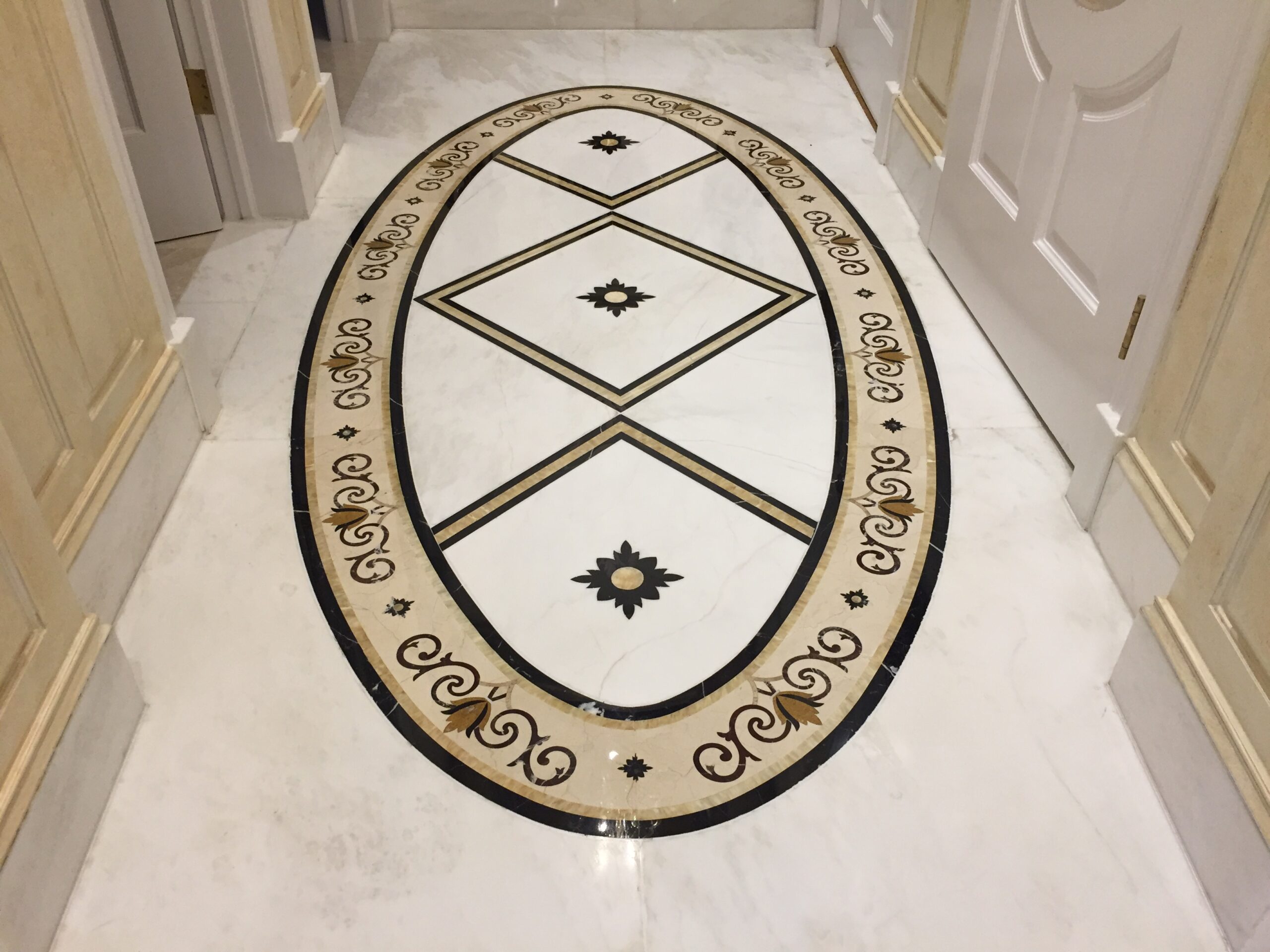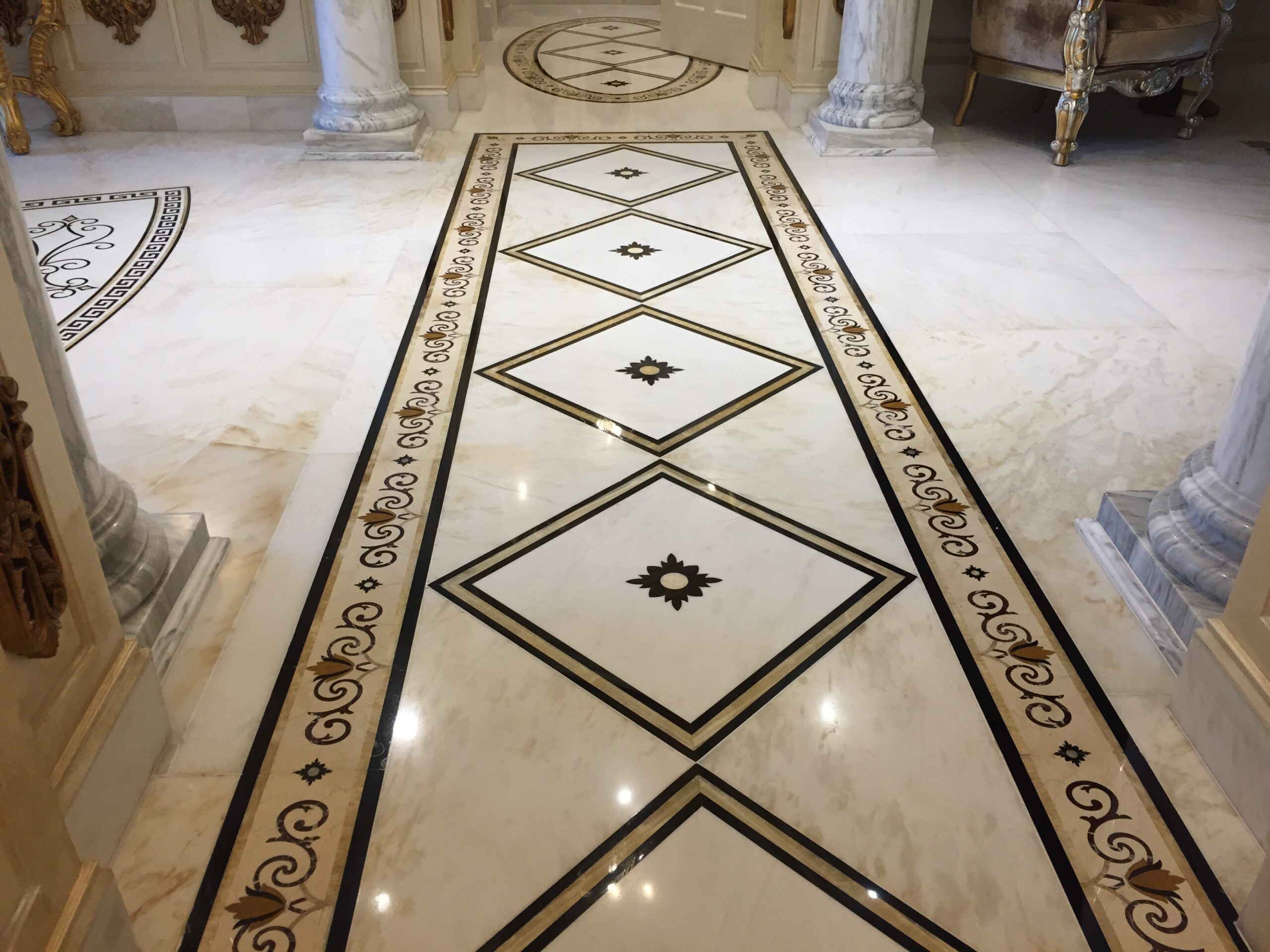 The flooring is white Bianco Namibia marble, custom-fabricated from three-quarter-inch slabs, and waterjet cut to create intricate designs. Before installation, all pieces were laid out in the workshop to ensure the pattern was correct. The use of Crema Marfil for the borders adds a warm and pleasant touch to the work.