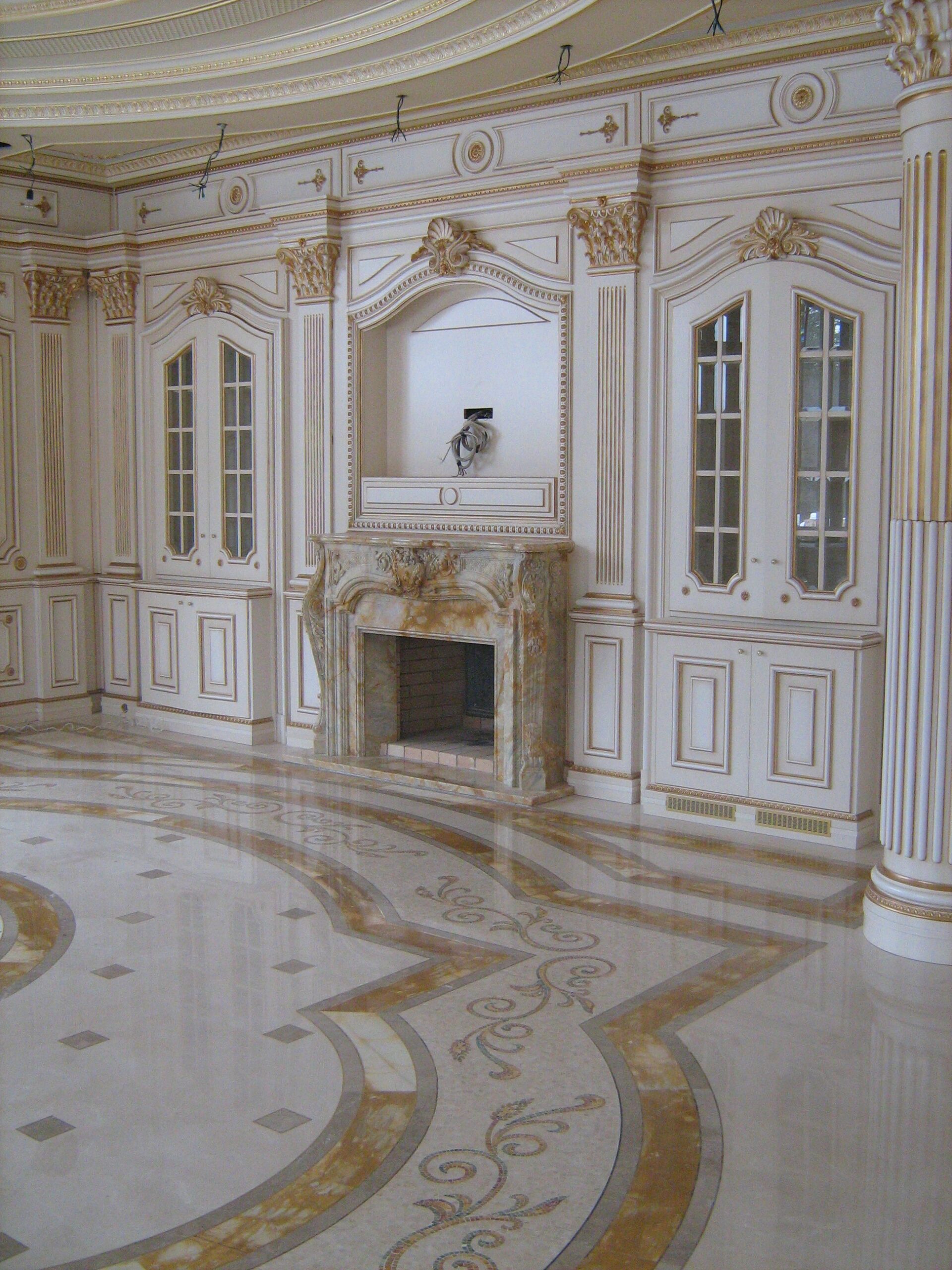 The fireplace mantel, made from the same Giallo Siena marble, is hand-carved in Italy — a true statement of craftsmanship. Every floor piece has been precisely cut to size using water jet technology, ensuring flawless alignment. At the border’s center, Spanish Crema Marfil pieces and gold leaves form a refined, custom motif.