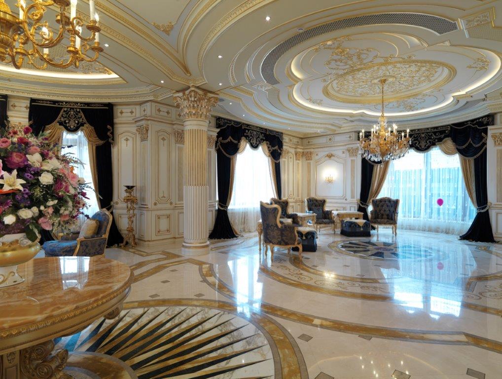 This opulent “Great Room” is a stunning example of classic luxury design, part of a grand mansion project in Russia. The focal point of the space is undeniably the meticulously crafted polished marble floor, which showcases a sophisticated blend of three distinct marble types: Crema Marfil, Italian Giallo Siena, and Calacatta Gold.