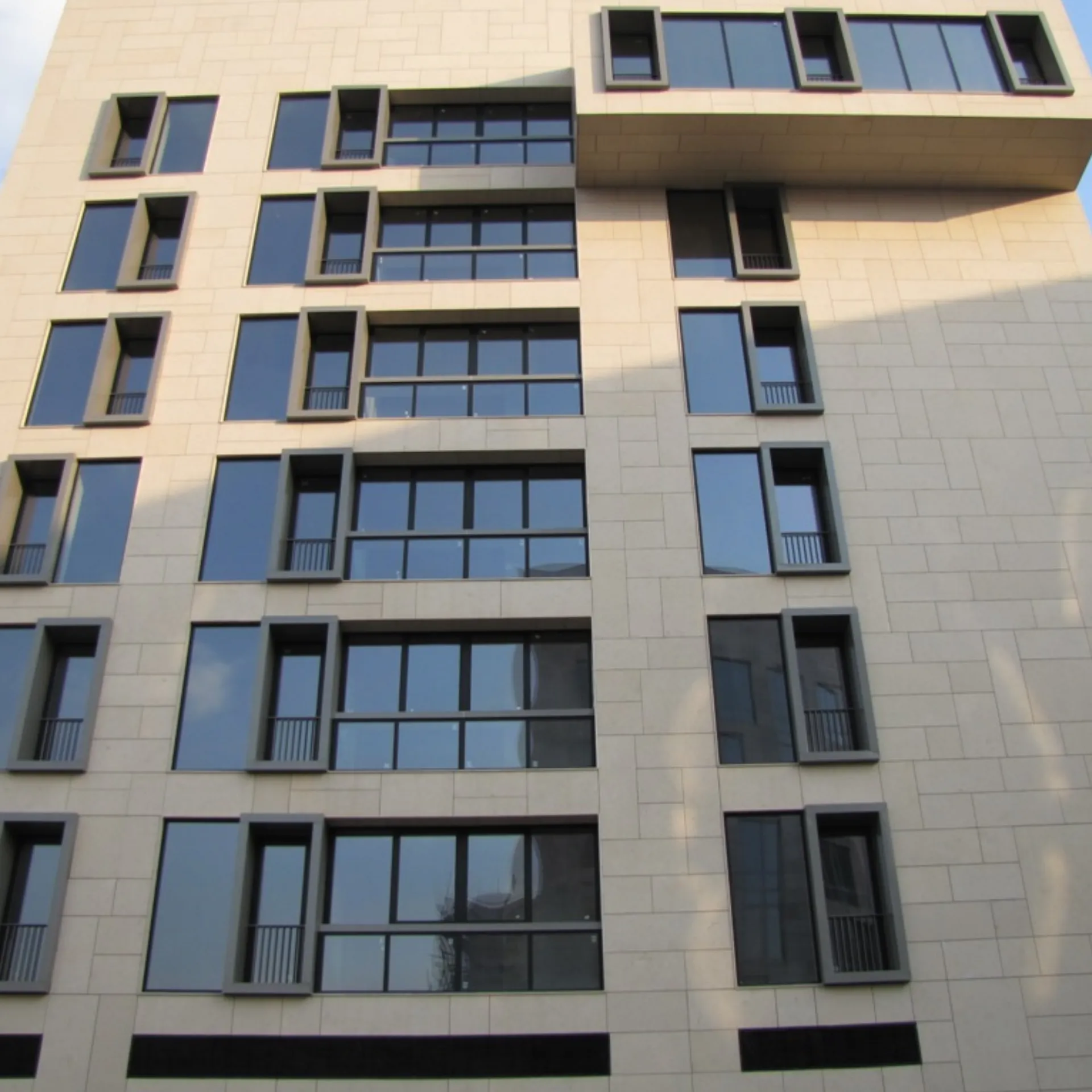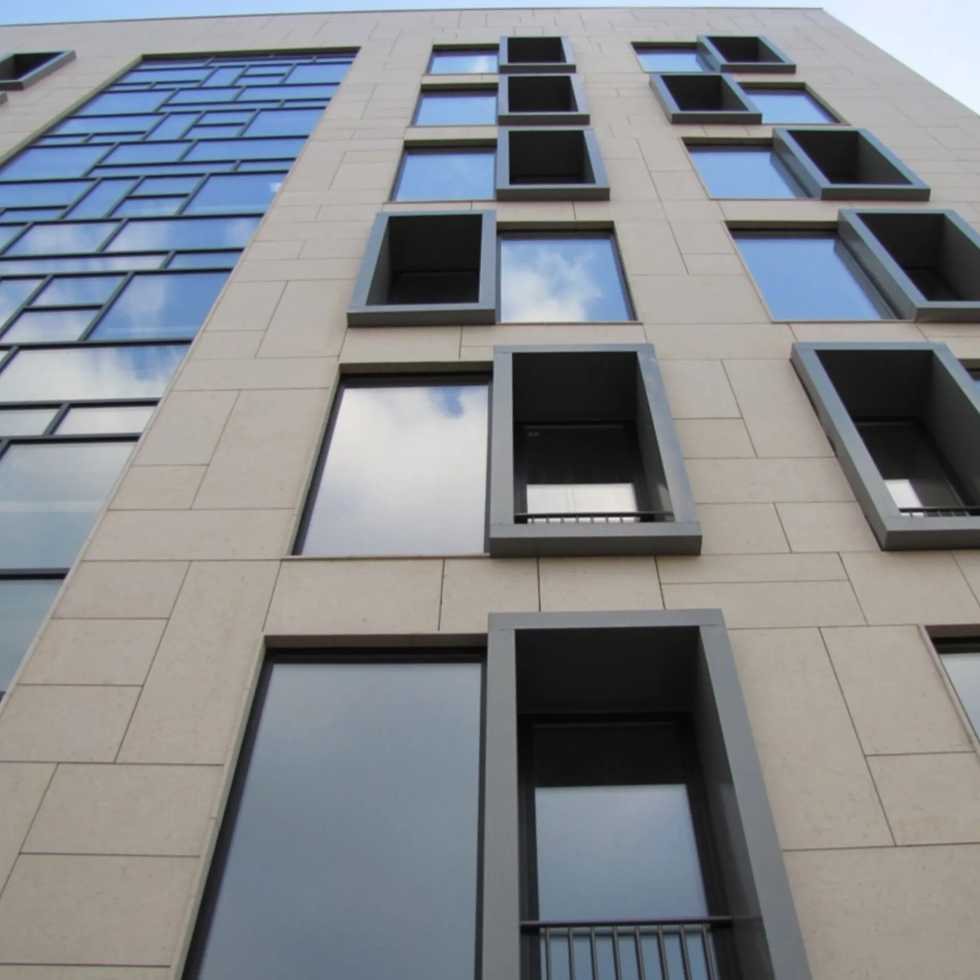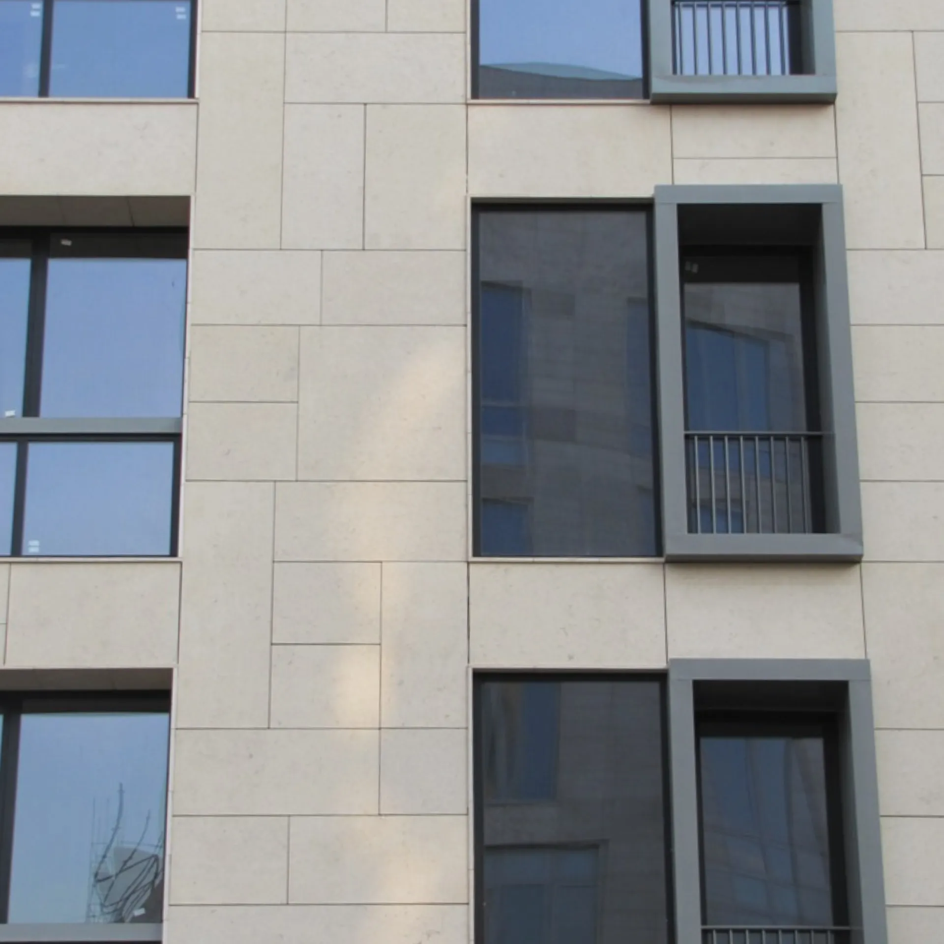 What sets this project apart is the unique knitted or basket-weave appearance of the façade. The limestone slabs are layered in an alternating up-and-down rhythm, creating a visually textured surface. Around the windows and from the base to the top of the building, the panels were custom-cut to perfectly match each section. The entire cladding system was mounted using a mechanical installation method, ensuring both durability and aesthetic precision.