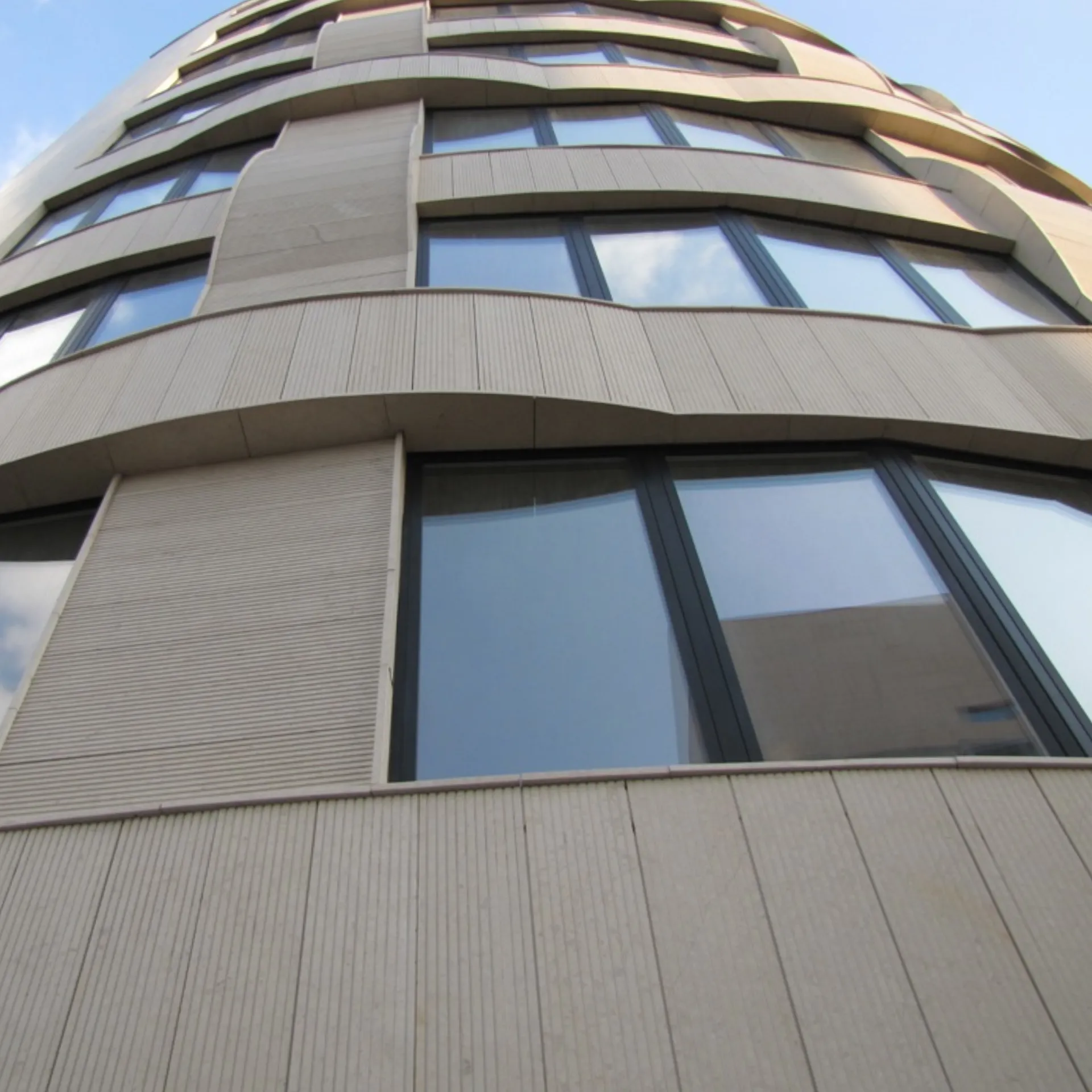This project showcases the application of European limestone in a contemporary commercial structure. Although the limestone panels were fabricated with straight cuts and a thickness of 2 inches, they were installed in a curved pattern to follow the rounded form of the building.