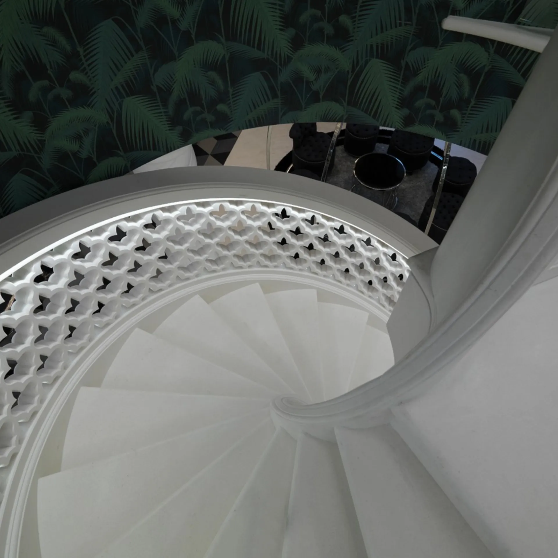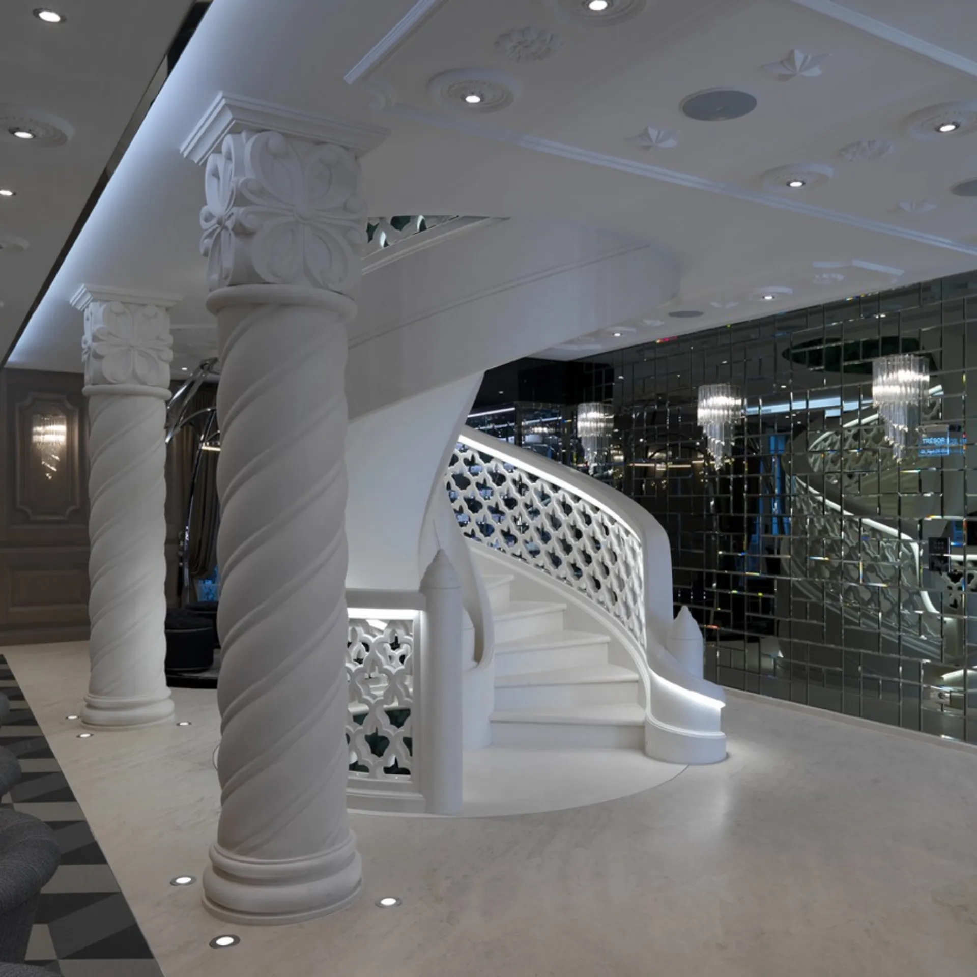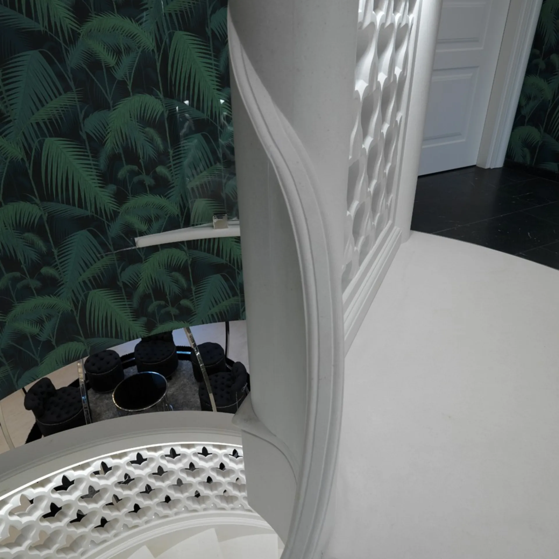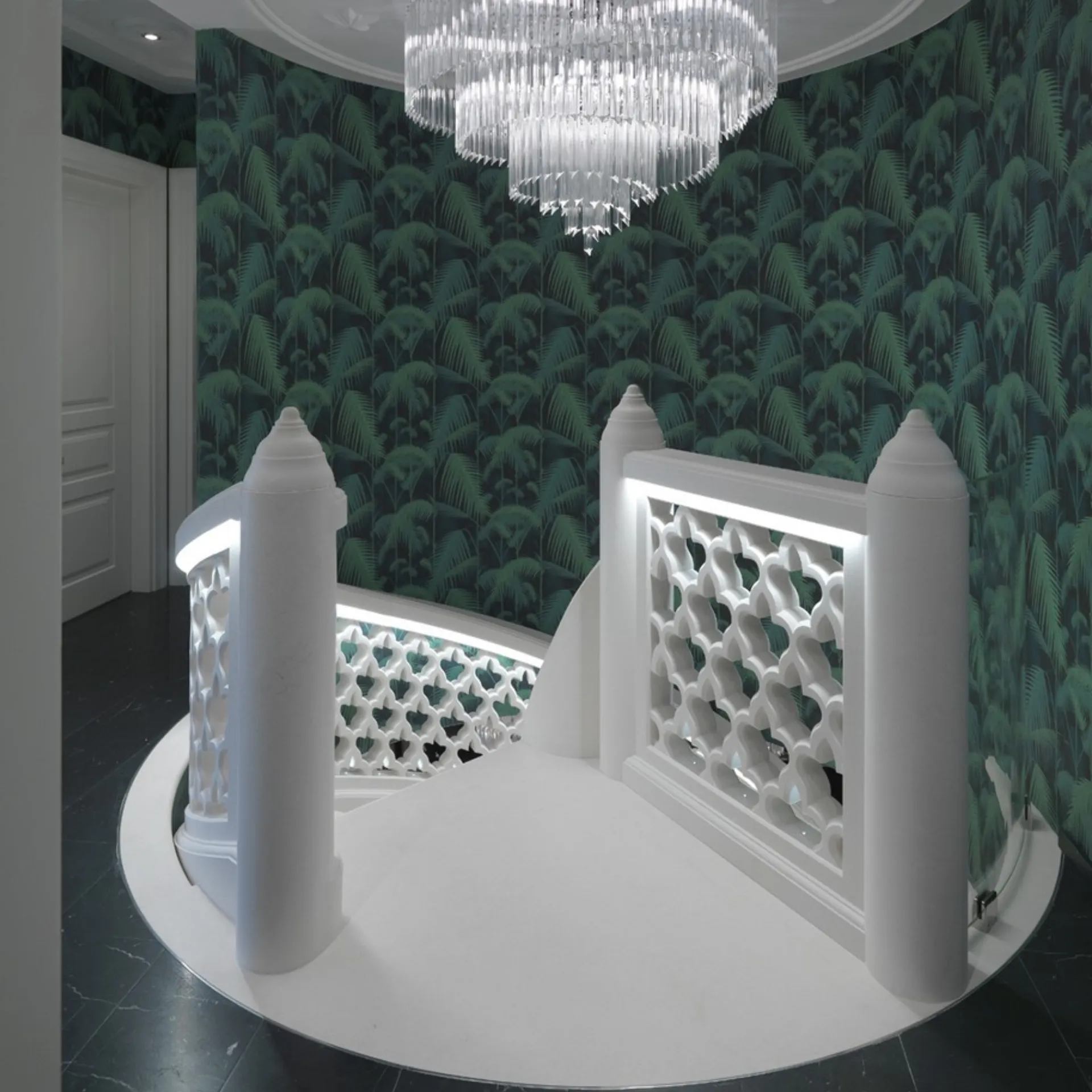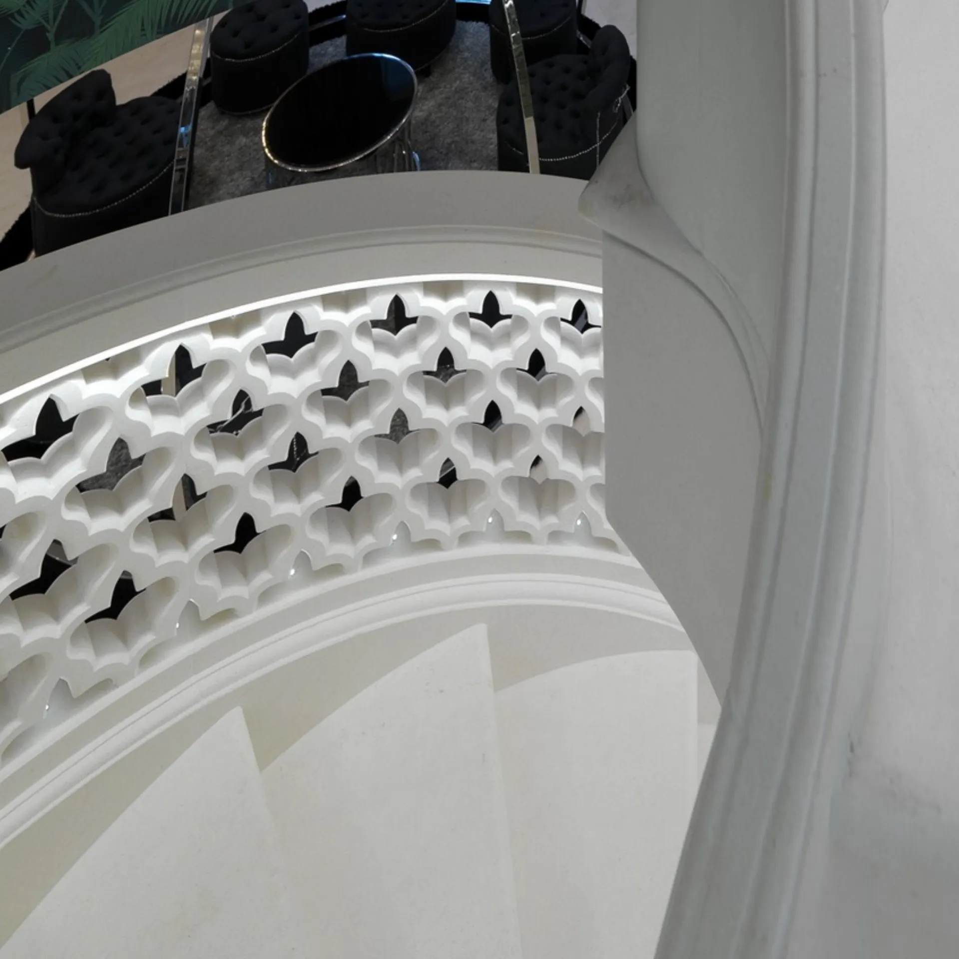 Ascending these steps feels like walking on petrified clouds. The marble’s muted whisper against light crafts a serene yet dynamic spatial rhythm.