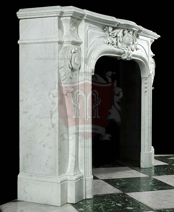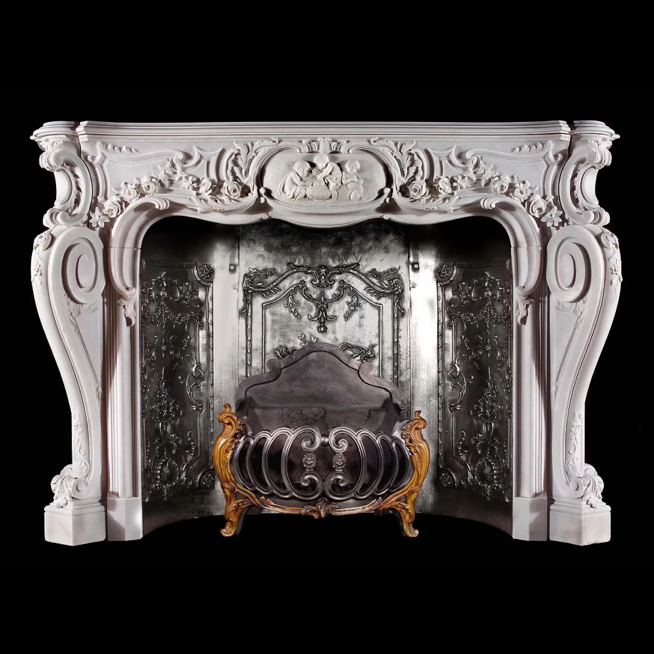 Louis XV Elegance: Known for its romantic Rococo influence, these mantels feature flowing serpentine lines, scalloped shells (rocailles), and delicate floral motifs. Perfect for adding warmth and movement to a grand salon.